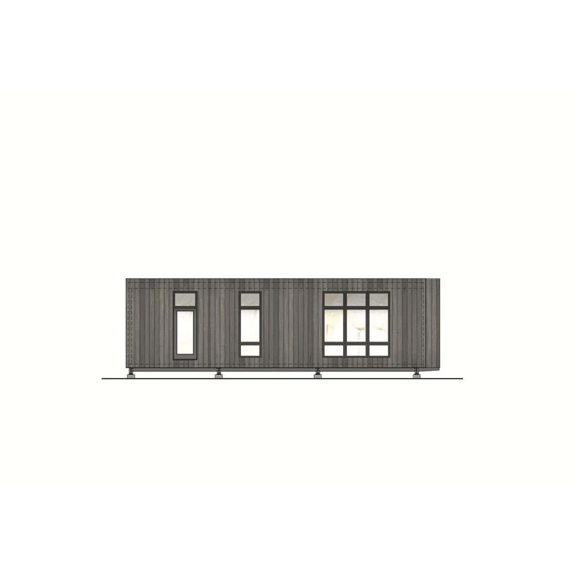 The studio unit offers a full kitchen, dining room, living room, fireplace, one bedroom, en suite bath and one half bath, wood floors, walk-in mechanical closet, stackable washer/dryer, floor-to-ceiling windows, and custom designed cabinets. The B version of the plan offers additional windows and a door on the great room end of the house. All homes come with a spruce cladding exterior.
