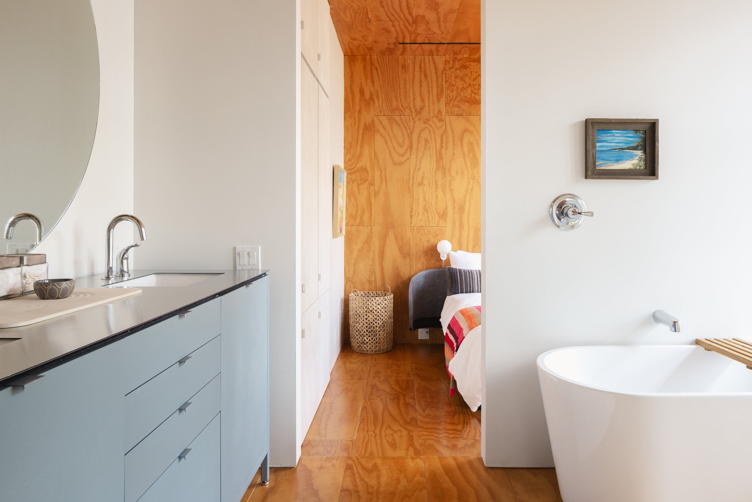 This home has two bedrooms with queen beds. The master bedroom sits at the back of the house looking out towards the lake and has an En Suite bathroom with a large soaking tub. The guest bedroom is located at the front of the house with a guest bathroom accessible from the hallway. The main living space of the house is an open concept with a chef's kitchen and long island, a living room with lots of seating, a large TV, and a dining table that can seat 6. A desk nook is tucked in the long main hallway that connects the two wings of the home.