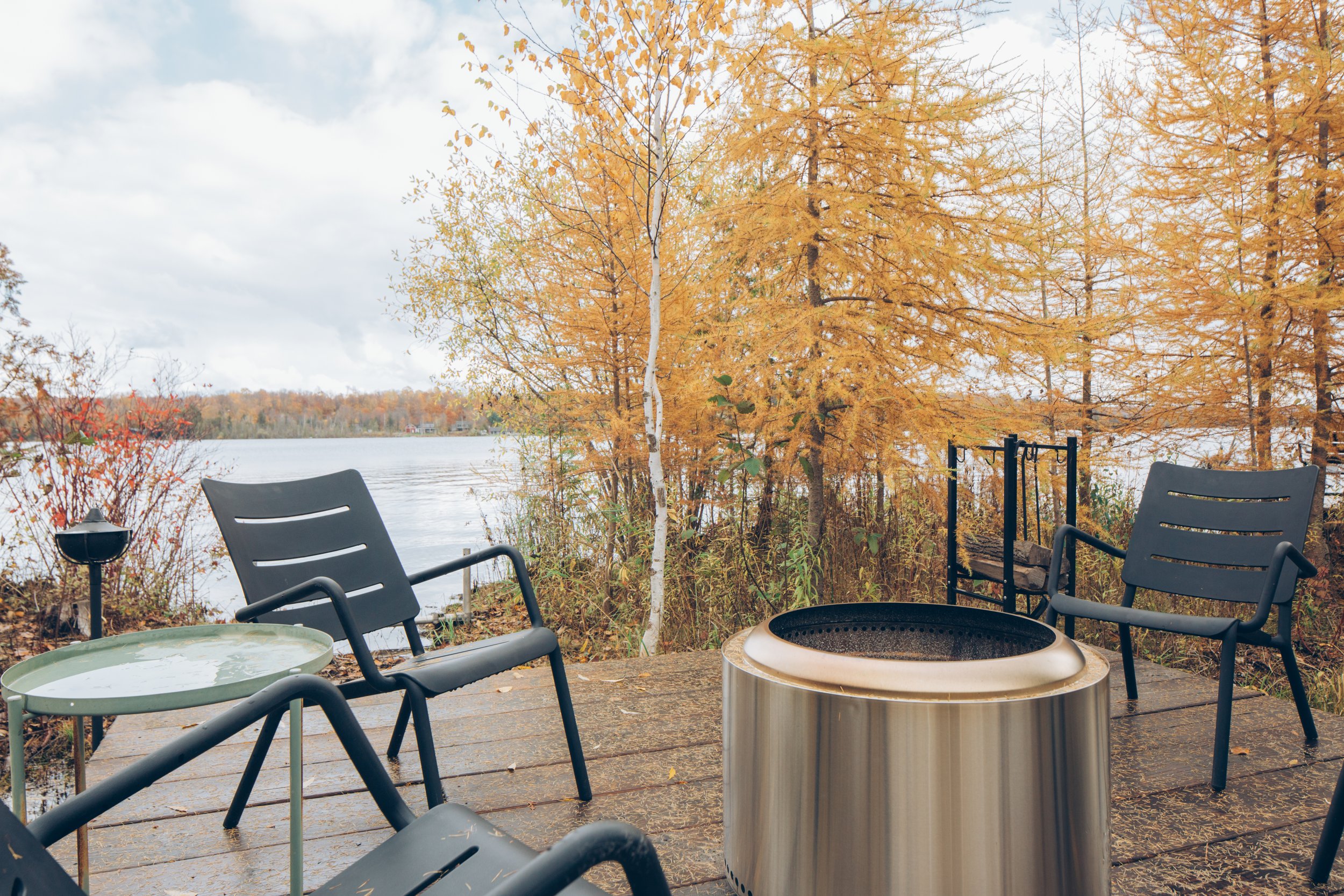 A long raised path allows you to walk through the wetlands down to a patio area where there is seating and wood wood-burning fire pit. There is an extended dock with additional seating offered during the summer and fall seasons.