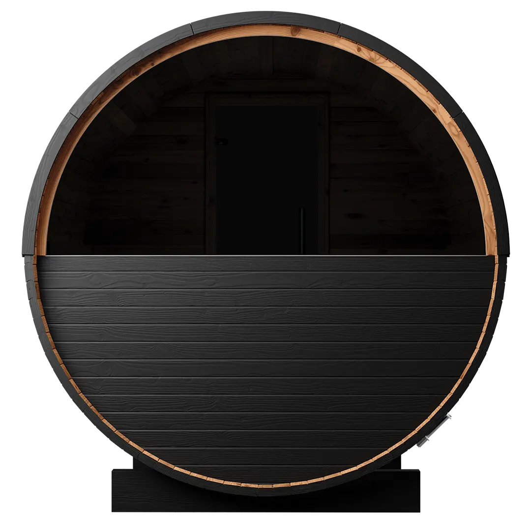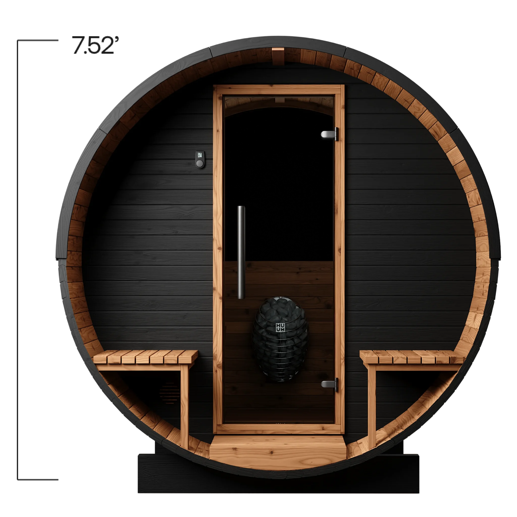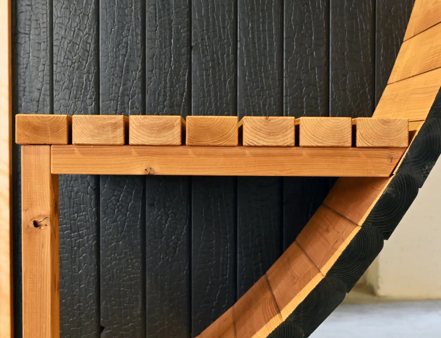 The Ignite Barrel Sauna redefines tradition with bold design and premium performance. Crafted from thermally modified Nordic spruce and finished with a striking, charred aesthetic inspired by shou sugi ban, it offers a mess-free, flame-free exterior that’s both dramatic and durable. The thick staves enhance structural strength, heat retention, and sound insulation, while the spacious interior—over seven feet wide—invites full-body relaxation with deeper benches and generous headroom. Engineered for lasting performance, the sauna is naturally rot-resistant for up to 25 years and holds its shape in any climate. Over time, the rich black finish can gracefully weather to silver or be preserved with a UV-protective treatment, offering flexibility in appearance to match its modern functionality.