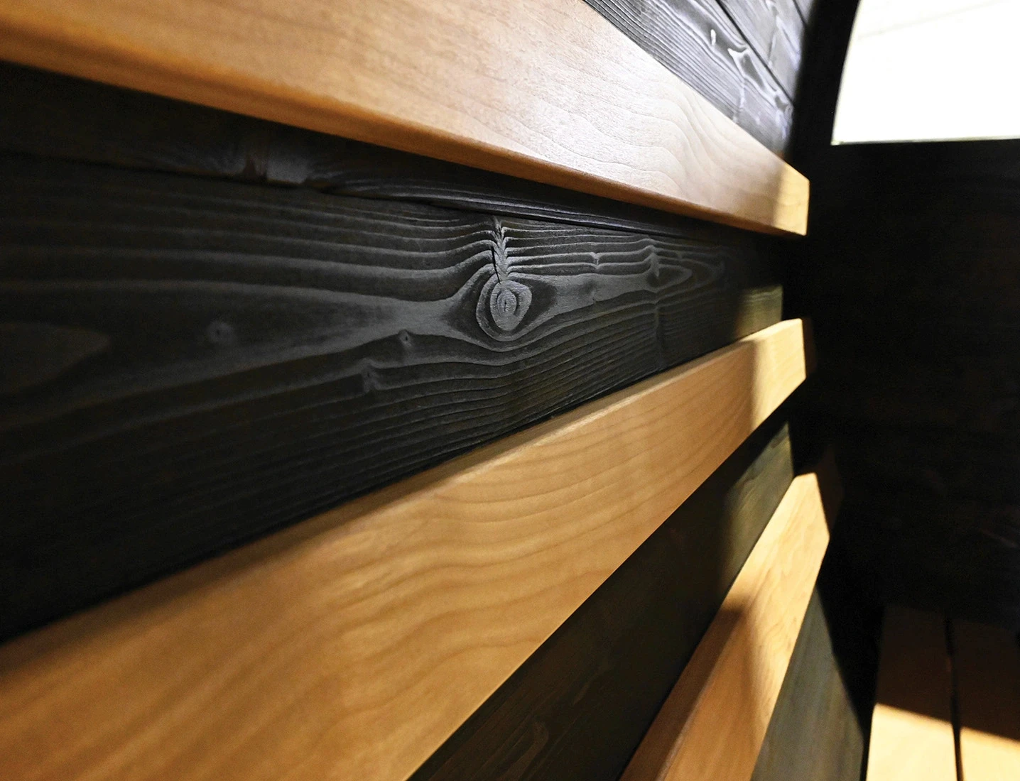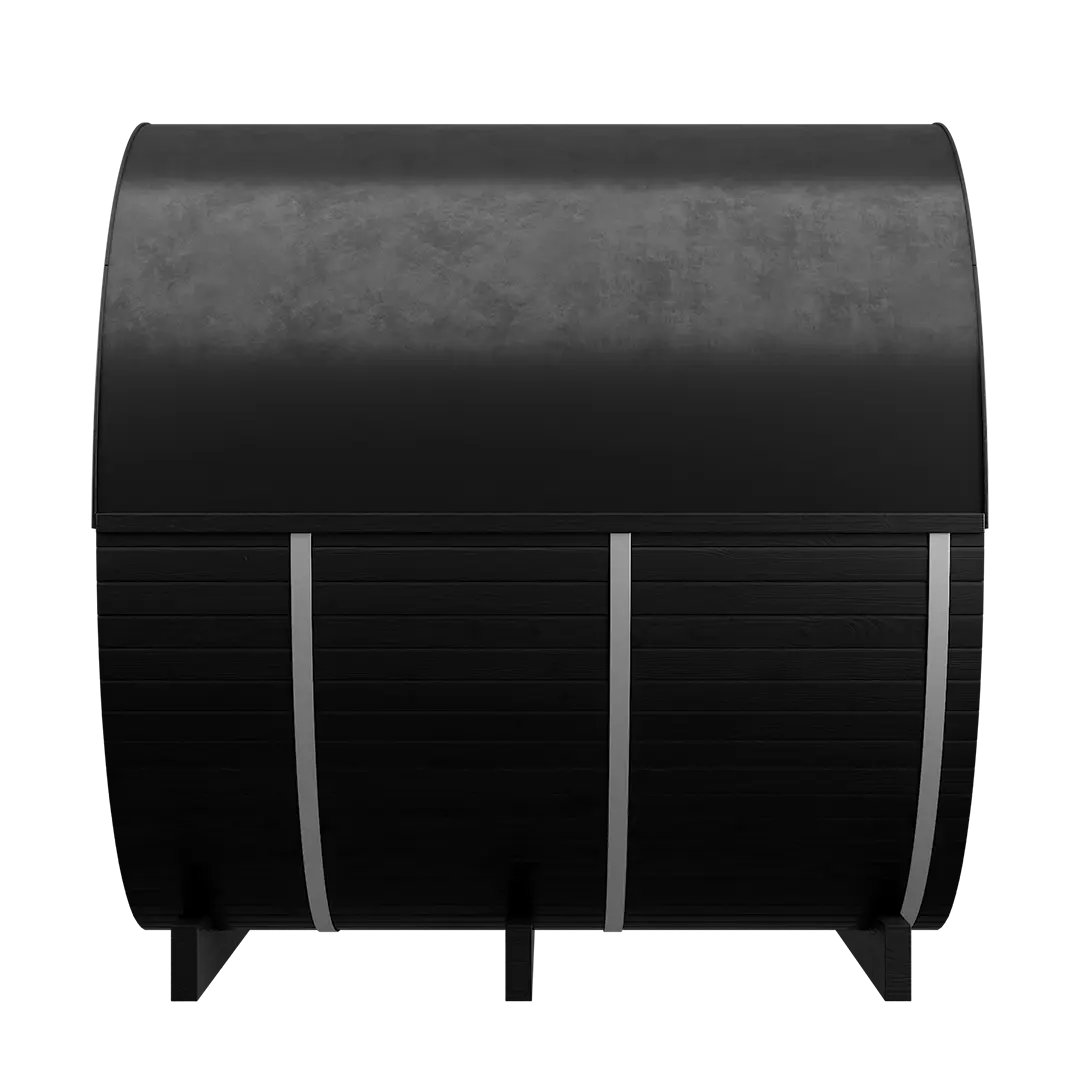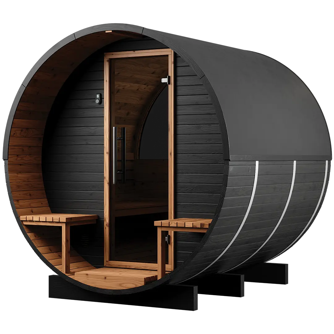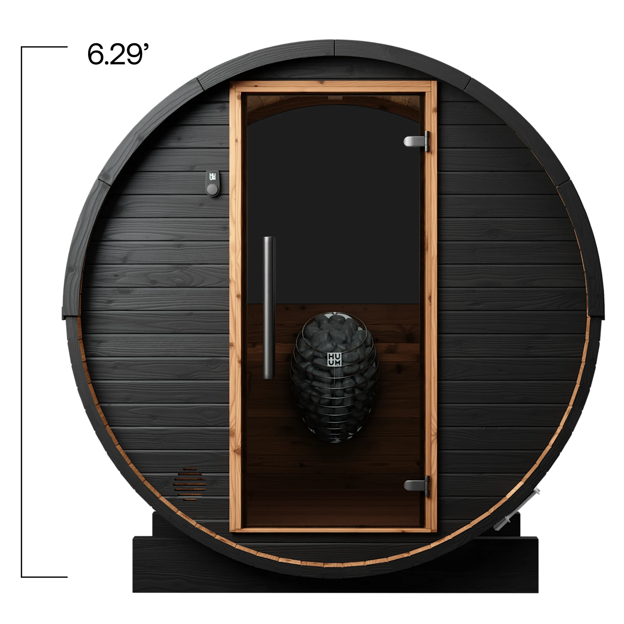 The Ignite Barrel Sauna redefines tradition with bold design and premium performance. Crafted from thermally modified Nordic spruce and finished with a striking, charred aesthetic inspired by shou sugi ban, it offers a mess-free, flame-free exterior that’s both dramatic and durable. The thick staves enhance structural strength, heat retention, and sound insulation, while the spacious interior—over seven feet wide—invites full-body relaxation with deeper benches and generous headroom. Engineered for lasting performance, the sauna is naturally rot-resistant for up to 25 years and holds its shape in any climate. Over time, the rich black finish can gracefully weather to silver or be preserved with a UV-protective treatment, offering flexibility in appearance to match its modern functionality.